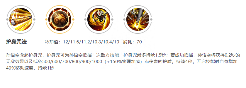 使用一技能后,孙悟空可以在1秒提升40%移速,在1.5秒内获得护身咒,护身咒可以抵挡一次敌方技能,抵挡成功可以获得短暂无敌和持续4秒的护盾。