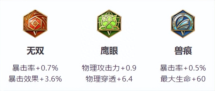 PS:孙悟空的被动是自带暴击率,无双与兽痕可以增加13%的暴击率,使得初始暴击率能达到33%。通过无双的弥补,使得初始暴击效果为186%,使得输出更高。鹰眼提供物理穿透可以增加孙悟空的穿透效果,增加伤害。