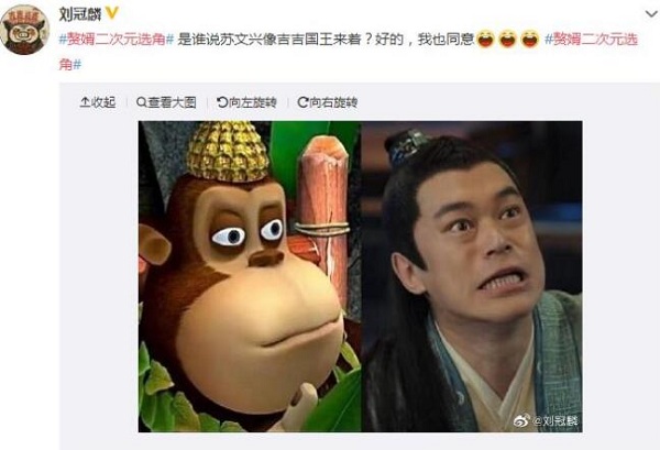 另一种就是现在正在热播的《赘婿》电视剧中的梗,扮演苏文兴角色的刘冠麟在剧情中的模样和吉吉国王很相似,便被网友们称之为了“吉吉国王”。