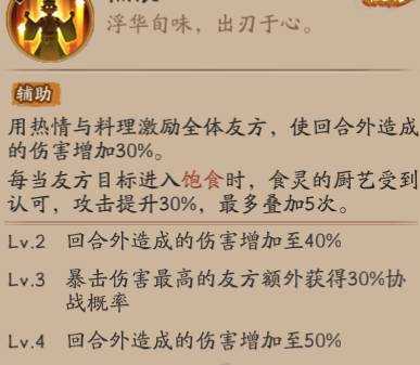 用热情与料理激励全体友方,使回合外造成的伤害增加30%。每当友方目标进入【饱食】时,食灵的厨艺受到认可,攻击提升30%,最多叠加5次。