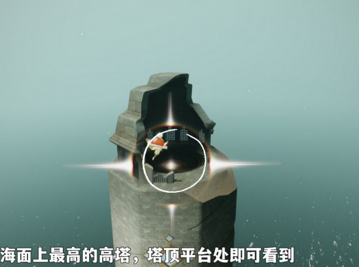 1、进入到潜海季的地图中,我们可以在海面上看到最高的一座高塔。