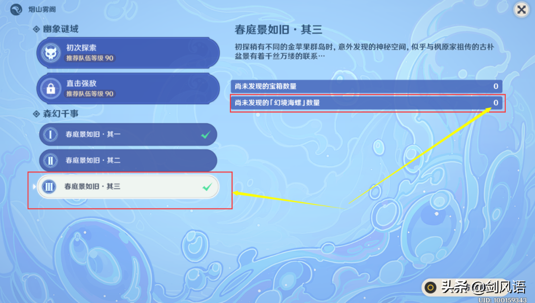 打开这个界面后,点击【春庭景如旧·其三】,在界面的左侧,你就看有两个选择,【尚未发现的宝箱数量】和【尚未发现的「幻境海螺」数量】,海螺未拿和宝箱未拿完 。点击右下角【造访幻境】即可进入秘境,其一其二也是。