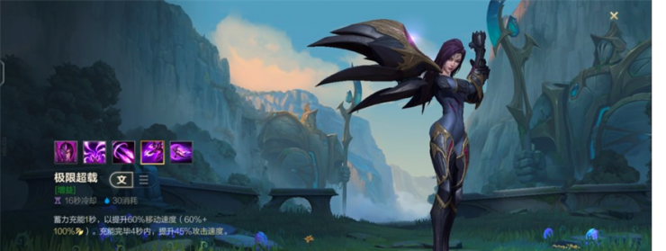 卡莎的E(3)技能:极限超载,卡莎暂时提升1秒的60%+100%AD攻速的移动速度,随后提升45%攻击速度。活体武器:这个技能得到升级,可短暂提供隐形效果,65%攻速。这个技能是卡莎高机动性的体现。这个技能的多数运用是追人时开,因为技能在加载(提升移速)的时候是不能够平A的,所以这个技能最好打架前就开启,保证打架时的输出最大化没有平A间隔;有一个技巧是施放E(3)技能时,可以施放Q(1)技能,来弥补没法平A的时的输出间隔。