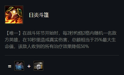 【唯一】在战斗环节开始时,每2秒灼烧2格内随机一名敌方英雄,在10秒里造成真实伤害,总额相当于25%最大生命值,该敌人收到的所有治疗效果降低50%
