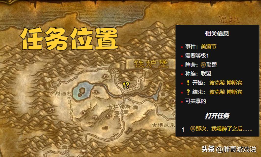第四个成就是干掉黑铁矮人。这个成就一共有两步,第一步是在活动营地完成《扔酒杯》的任务,第二步是完成后续的《我喝醉了》任务。联盟方位于铁炉堡门口,部落方位于奥格瑞玛门口。