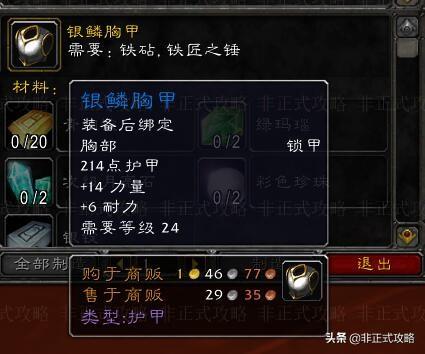 题外话:145技能学会【银鳞胸甲】,在某个游戏动画里面那个神棍德每天叫喊出售的“蓝色品质,5G一件”。装备属性还可以,凑齐材料是有点麻烦。