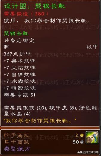281~300,制作【瑟银长靴/瑟银头盔】,280学会瑟银头盔/瑟银长靴的配方。瑟银长靴的材料:瑟银锭20+硬甲皮8+绿色能量水晶4。瑟银头盔的材料:瑟银锭24+红宝石1+黄色能量水晶4。制造出来的成品属于51级装备,卖店是1金3银36铜,可找附魔朋友帮忙拆出高级FM材料,至少能回收一些成本。