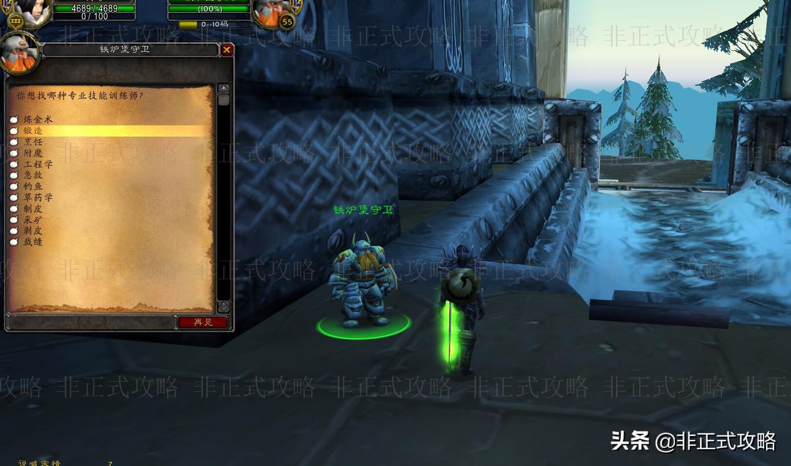 首先,我们在各大主城找到卫兵询问锻造专业的位置(地图上的红色旗帜),如下图所示,以铁炉堡为例。通常训练师旁边都有专业的供应商。