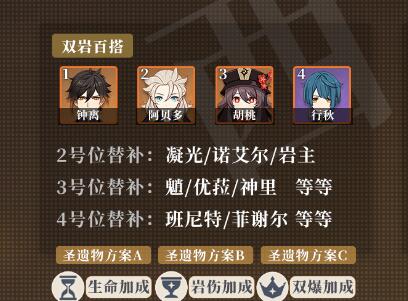 1、千岩牢固套是1.5版本的新圣遗物。无论携带“生爆岩”还是“生生生”的常规流派「钟离」,都首推千岩牢固套。因为它对护盾的加成实在太高了,同时还有着不错的全队增伤能力(20%攻击力)。护盾强效是仅对当前角色生效的属性(如钟离携带精1贯虹之槊,队友站场时无法享受到20%护盾强效加成),因此给队友施加的护盾强效是十分稀缺的属性。
