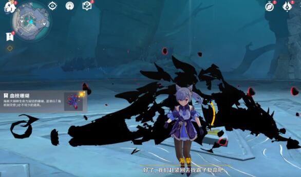 17、击败深渊咏者·渊火后,开启一段对话,可以在深渊龙蜥尸体上取得露子委托我们寻找的关键任务道具【血枝珊瑚】。