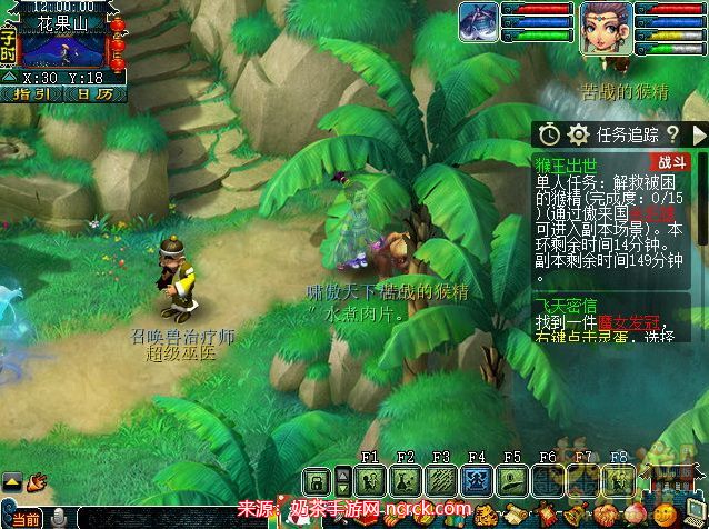 1、解决猴精:寻找猴精,使用ALT+A进入战斗。注意使用高分辨率窗口查找,注意树木和岩石的遮挡,猴精被遮挡时只能看到名字。在水帘洞的水幕也要留意。