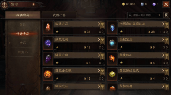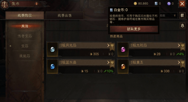 集市中的交易均使用白金币,购买普通宝石、传奇宝石和技能石都需要用到白金币。