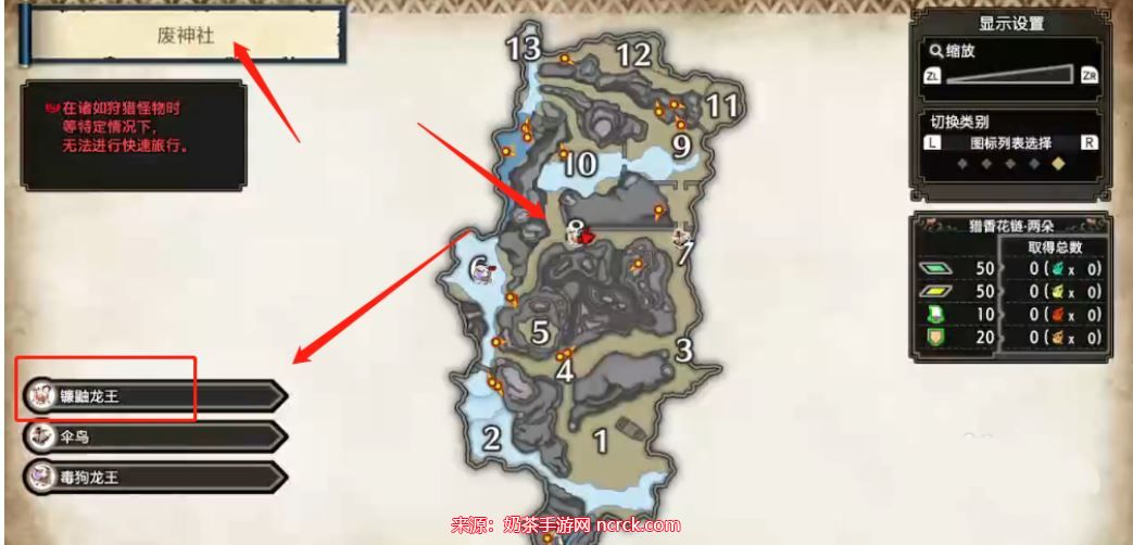 1、运行怪物猎人rise,进入游戏界面、打开废神社地图,找到镰鼬龙王,具体位置如图中所示