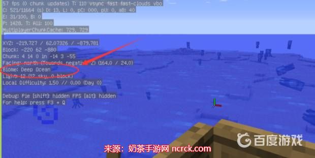 3、辨认深海区:一般来说,海底神殿位于深海区域。使用F3键弹出调试信息,找到Biome:Deep Ocean,这表示你进入了深海区。