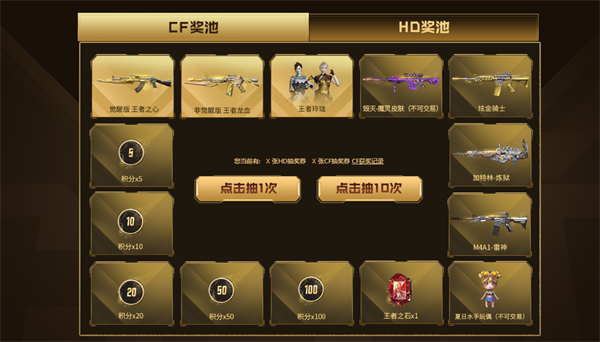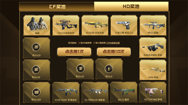 4、在目前的抽奖活动中,玩家可在CF奖池、HD奖池中自由选择抽取,每个奖池的奖励不同;