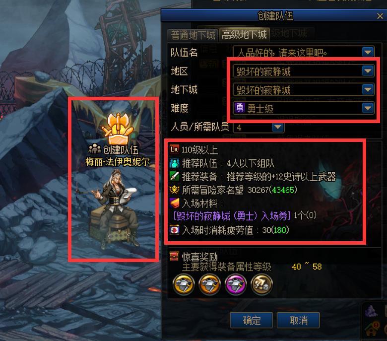 3、找到梅丽·法伊奥妮尔,名望到达17612即可进入普通级,点击创建队伍,选择副本难度,确定后点击梅丽·法伊奥妮尔头上的开始探险,消耗30点疲劳和门票即可进入。门票可通过刷图点商店、金绿柱石兑换或者拍卖行购买获得。