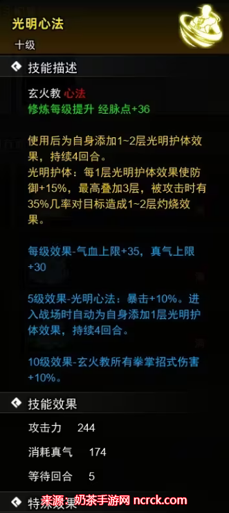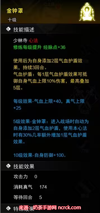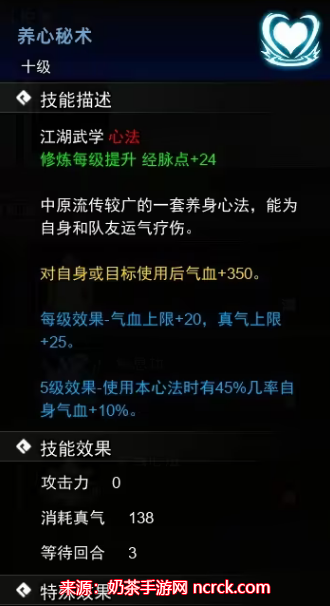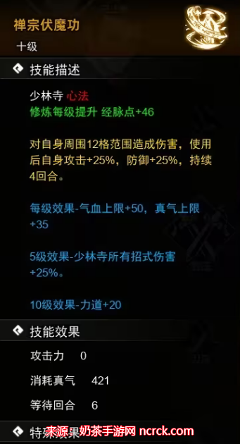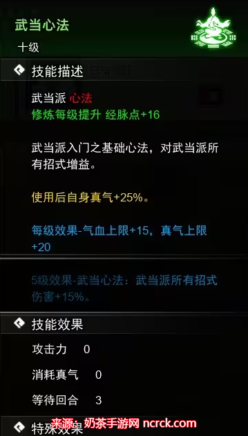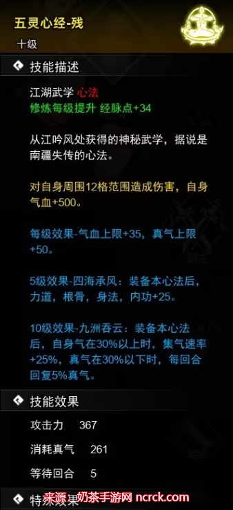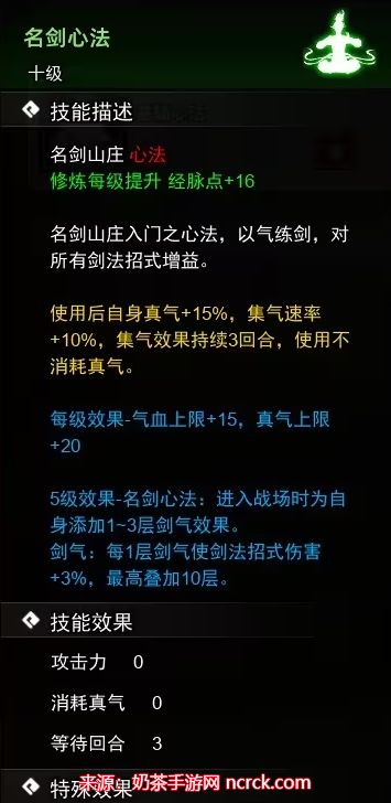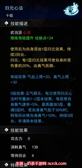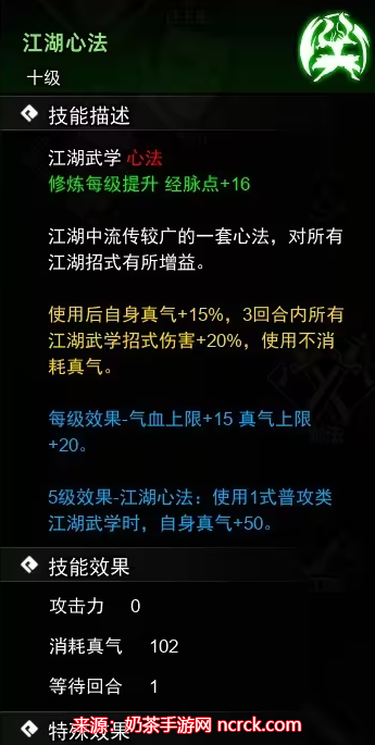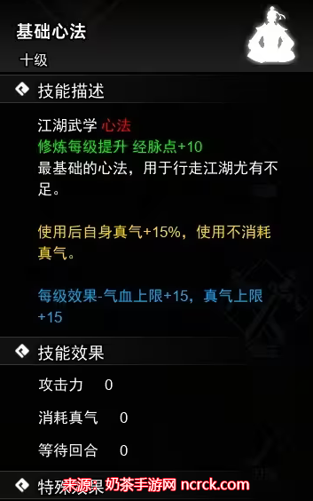 使用后自身真气+15%,集气速率+10%,集气效果持续3回合,使用不消耗真气。