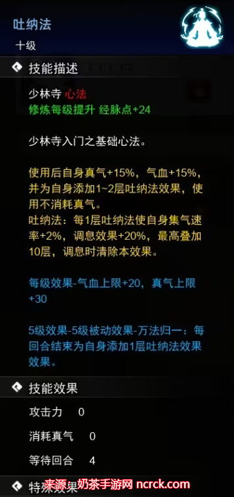 使用后自身真气+15%,气血+15%并为自身添加1~2层吐纳法效果,使用不消耗真气。吐纳法:每1层吐纳法使自身集气速率+2%,调息效果+20%,最高叠加10层,调息时清除本效果。