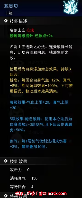 使用后为自身添加鲸息效果,持续3回合。鲸息:每回合自身气血+12%,真气+8%。期间调息效果+100%,不可使用招式。