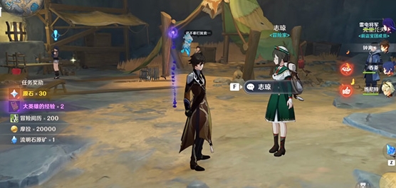 跟着剧情走,和瑾武对话几次之后完成两个委托任务,分别是“初识暗渊毒瘴现和踏破矿贼结新缘”,这两个任务没有什么难度,完成回到勘探营地提交任务即可获得【流明石原矿】。