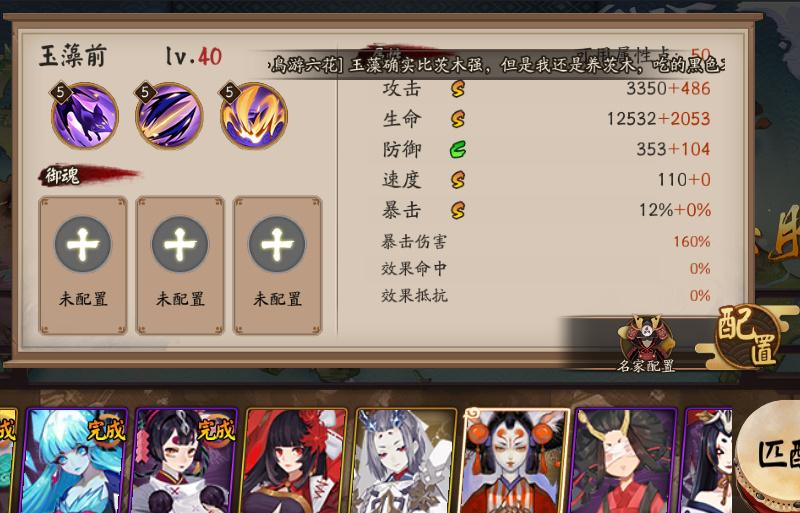 御魂为四件套破势+二件套暴击散件,六号位暴伤,设定暴击101%,总暴击伤害270%(御魂加成同雪童子,基础面板暴击伤害160%),对满血单位造成伤害降低15%。
