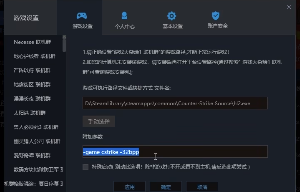 5、最后在下面的附加参数里输入“-game cstrike -32bpp”并保存。