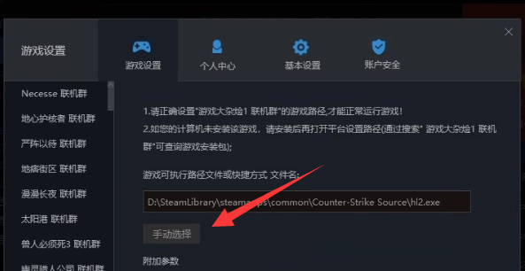3、然后在游戏设置里点击“手动选择”