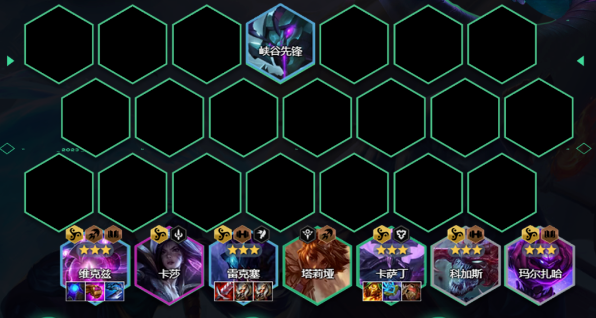 阵容的核心就是虚空单位的星级能够给峡谷先锋的法强和生命值,因此高星级虚空羁绊能够给提供质量的峡谷先锋,10级峡谷等级+6虚空峡谷先锋就能够有3000生命值,一个技能就能够打600的技能伤害。