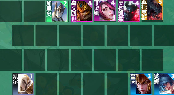 1、阵容组成:莫德凯撒、嘉文四世、凯尔、加里奥、娑娜、奎因、菲奥娜、亚托克斯