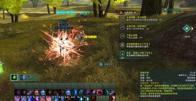 剑神无我:七秀的群战神技,副本打大量小怪时非常实用,单次伤害不管,但是可以持续20秒,累计伤害量相当高。缺点是一移动就中止了,同时也有可能被控制打断。