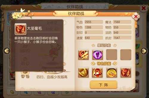 大鹏王高速出手,降低敌方血线,孙悟空出手点杀成功会召唤小猴子,回合结束小猴子出手可以完成补刀击杀(需要地脉满培养)、九灵元圣出手连环增加点杀能力,牛魔王能单能群有几率释放牛妖补刀。