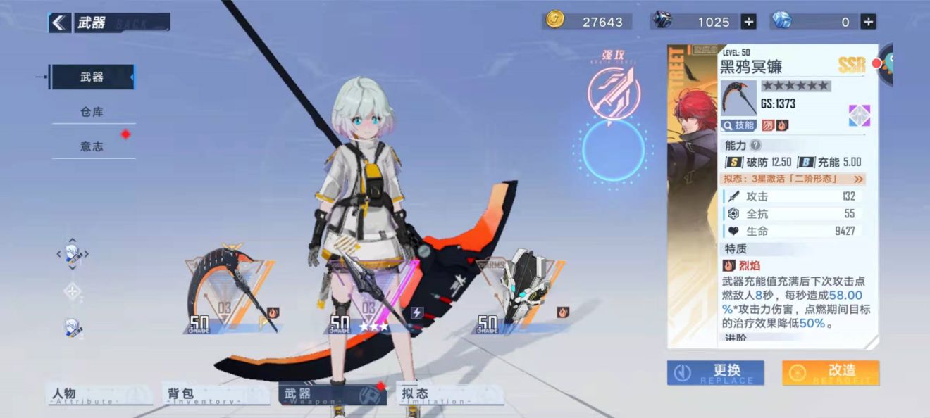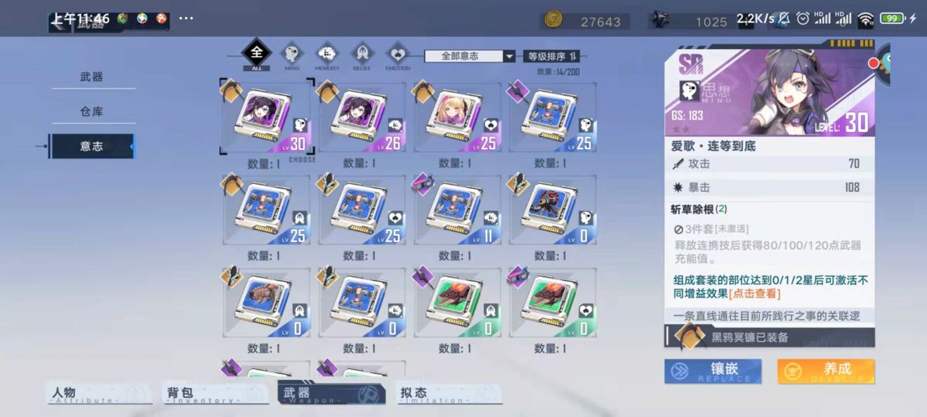 意志的主界面除了品质和GS加成图标还有意志立绘,N和R都是普通机械,SR,SSR分别为相应的拟态,意志的背后都有一个意味深长的故事大家有兴趣可以自行探索。