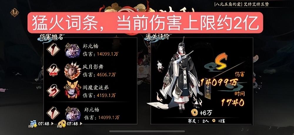 ②勐火词条:图示1.4亿,缘结神结缘太慢+7层缘2轮被控,运气好上限大概在17分钟2亿左右。