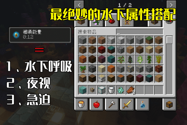海洋之心的唯一作用便是用于合成“潮涌核心”,它能赋予玩家一种名为“潮涌能量”的范围性状态属性,包括:水下呼吸、夜视以及急迫效果,毫不夸张地说“这是MC游戏中最绝妙的水下效果搭配”。