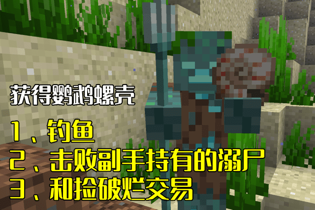 二、击败副手携带鹦鹉螺壳的溺尸;生成的溺尸将会有3%(JE)或8%(BE)的几率副手持有鹦鹉螺壳,而被击败的溺尸一定会将其副手所持物品所掉落。