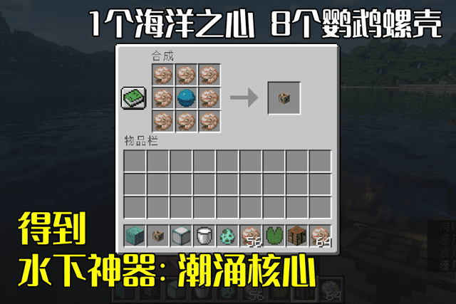 然后,我们准备好一个工作台,将海洋之心放在9宫格的中间处,随后用鹦鹉螺壳将其包裹起来,即1个海洋之心,8个鹦鹉螺壳,随后便会合成出一个潮涌核心。