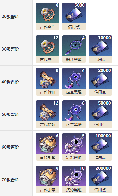 【古代零件*20】+【古代转轴*20】+【古代引擎*14】+【暗淡黑耀*4】+【虚空黑耀*12】+【沉沦黑耀*15】+【信用点*385000】