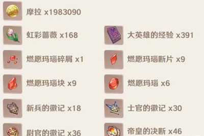 摩拉40000、燃愿玛瑙断片3、帝皇的决断2、虹彩蔷薇10、新兵的徽记15;