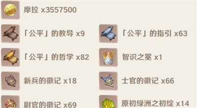 【公平】的哲学*16、尉官的徽记*12、原初绿洲之初绽*2、智识之冕、700000摩拉;