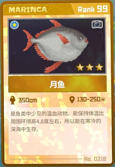 捕捉方法:在蓝洞深海180米深左右的区域里,可以遇到一大一小两只月鱼,出现的时候可以使用拍照功能。