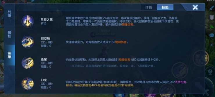 1、被动:当曜技能命中目标时则可以回复自身2%血量,没使用一次技能可以积攒一格星辰之力(一共三格),当星辰之力攒满后,可获得一个强化技能,且当释放该强化技能后就能获得一个强化普攻;