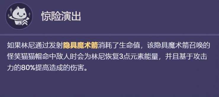 如果林尼通过发射隐具魔术箭消耗了生命值,该隐具魔术箭召唤的怪笑猫猫帽命中敌人时会为林尼恢复3点元素能量,并且基于攻击力的80%提高造成的伤害。