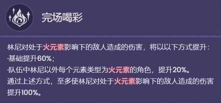 队伍中林尼以外每个元素类型为火元素的角色,提升20%。