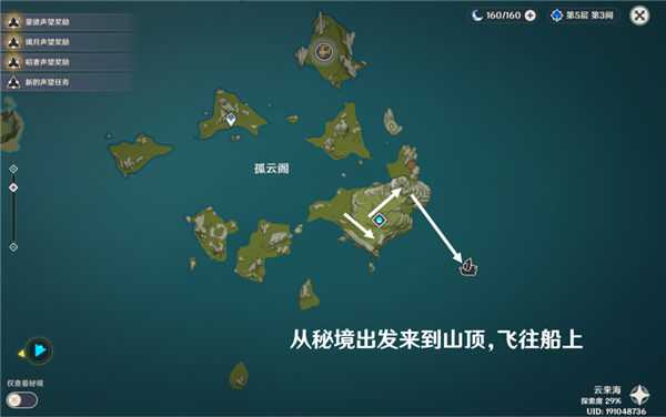 前往方式,由于一年前的海灯节更新了船只的点位,使其能在大地图上看到,所以可以直接传送。不过我也推荐麻烦一点的路线——从孤云阁秘境处上山,来到山顶后飞向「死兆星号」,毕竟这才是冒险啊。