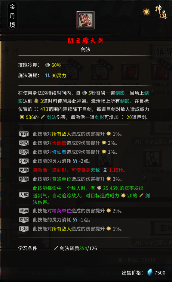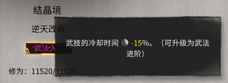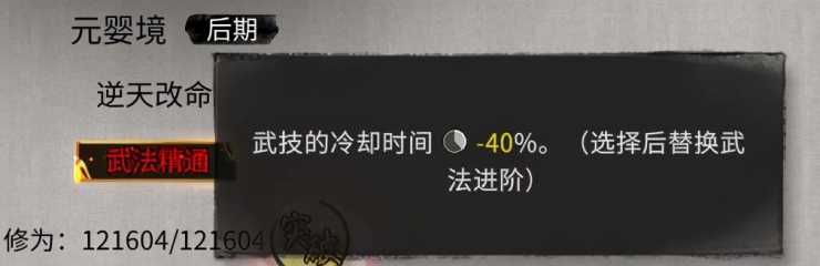 当前版本(V0.8.1056.178)最终逆天改命武法精通。武技的冷却时间-40%。(选择后替换武法进阶)