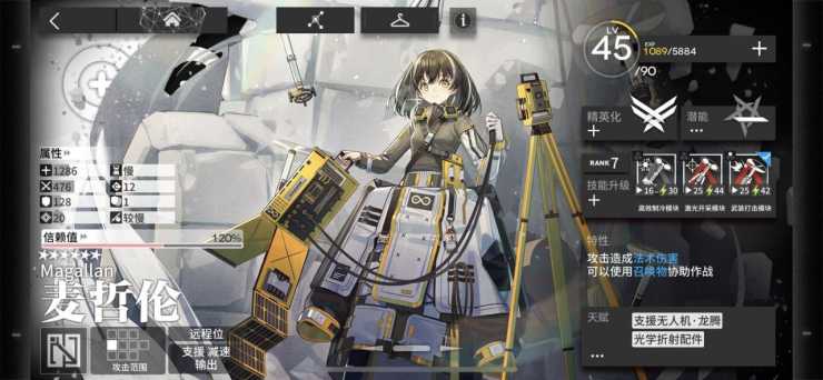 面板属性:类似于梅尔和深海色,麦哲伦拥有着标准的辅助类干员面板。
