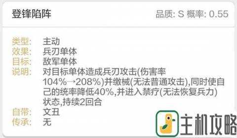 战法:这个战法就相当夸张了,首先这是一个瞬发55%概率战法,触发期望相当高,一局放3-4次是没有问题的;单体208%的伤害,说实话挺一般,但是毕竟发动率这么高了,而且伤害也突破了200%,伤害期望也不低;后面这条就大开眼界了,对那个人缴械,但对自己降低统率和禁疗,持续两回合!这感觉是一个自爆buff,因为单体两回合缴械在控制只能算中上水平,反而是他这个给自己的debuff非常厉害!碰巧的是,降低统率和禁疗刚好是可以很好搭配的负面效果。降低统率扣血就多,还会导致治疗不溢出;再给一个禁疗,那基本上就是一个伤敌1000,自损10000的buff。