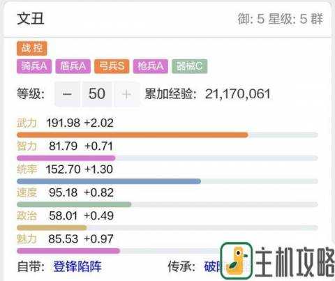 身板:满级武力勉强突破190,只能算二线武将武力。统率突破150,也是中上水平的统率值;智力较低,但是突破80大关,不算zz,起码不会像乌骨大王一样被村夫算死速度中下水平,抢一速有点困难。