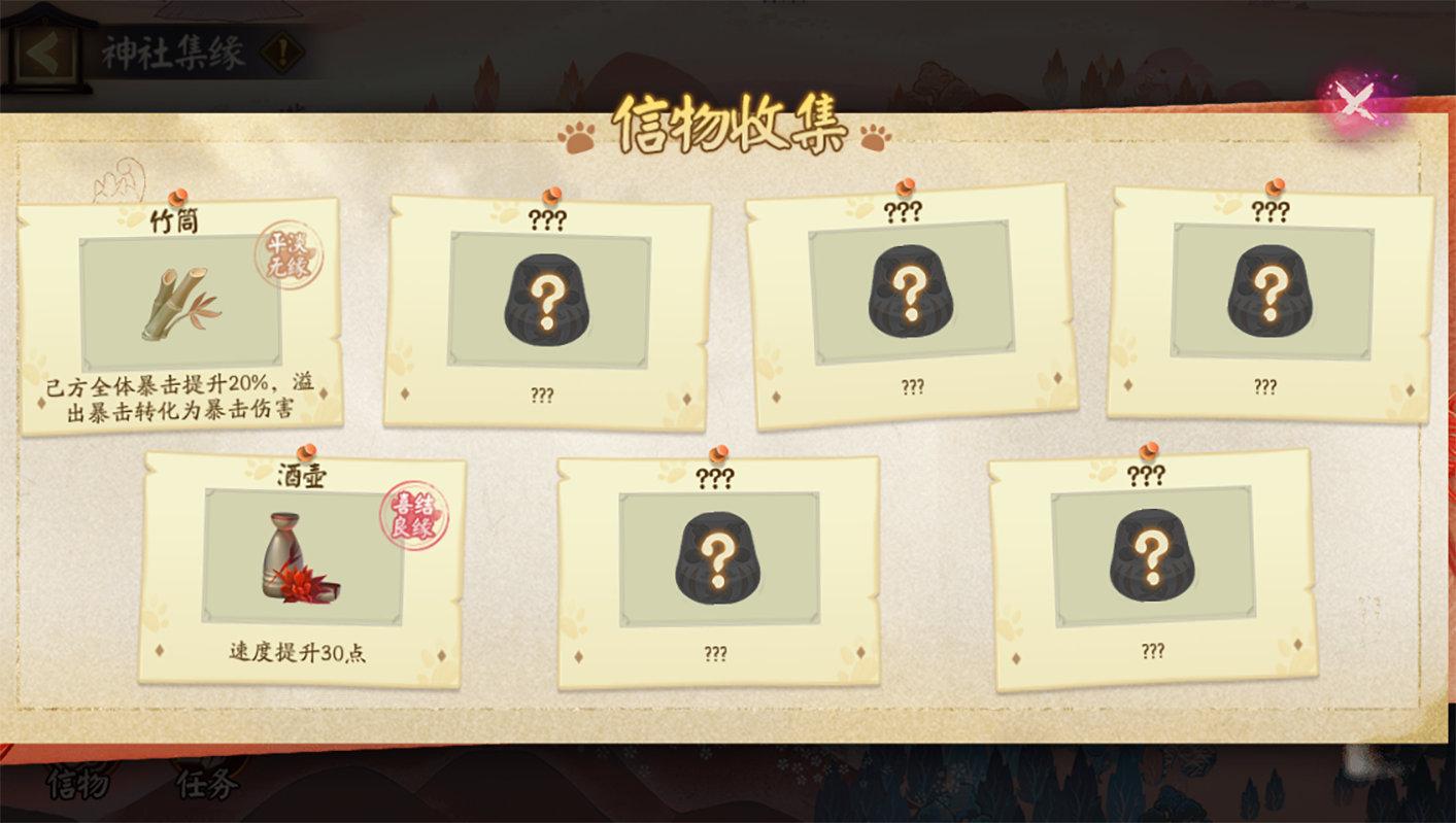 ※每一种信物将对应不同的属性加成,大人可前往信物界面查看已收集的信物种类,已获取的信物将在「神社集缘」战斗中生效。