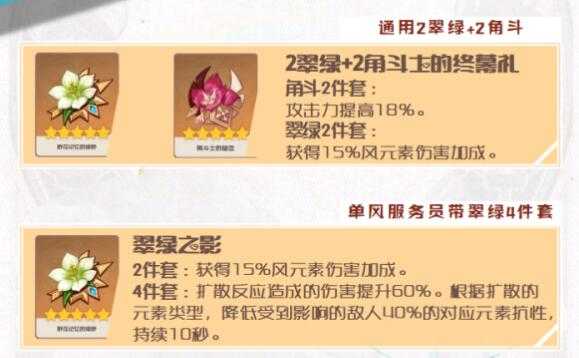 圣遗物:2角斗+2翠绿通用性比较高,4翠绿基本是用在单风可辅助队伍的情况下